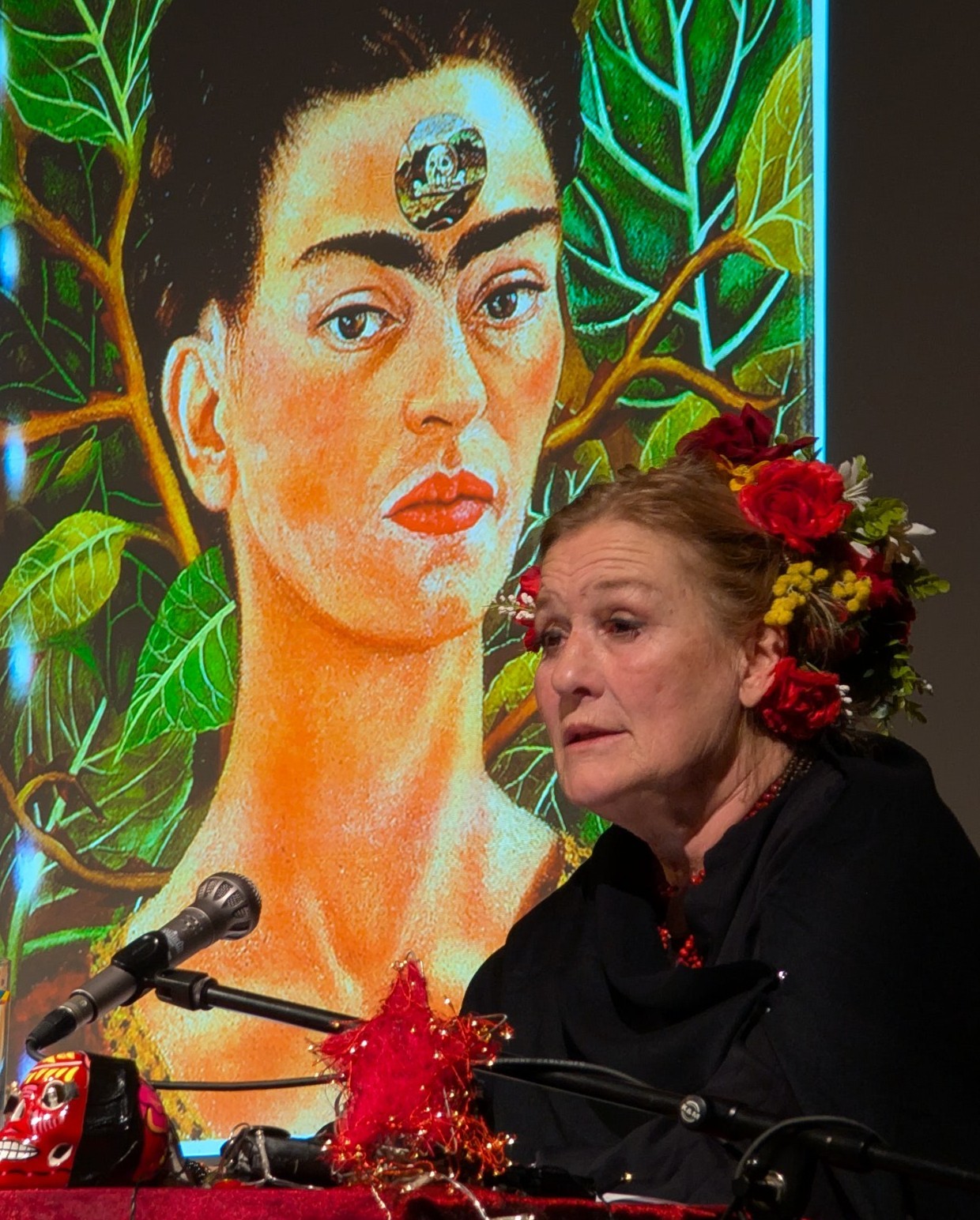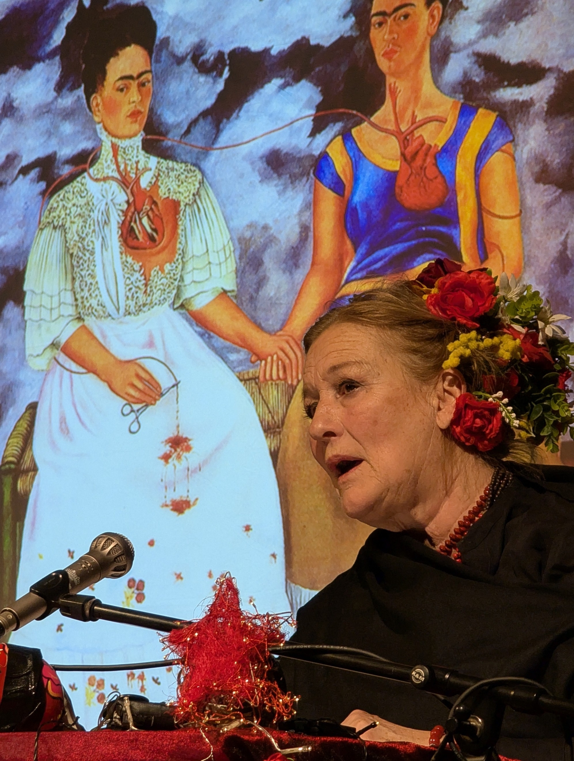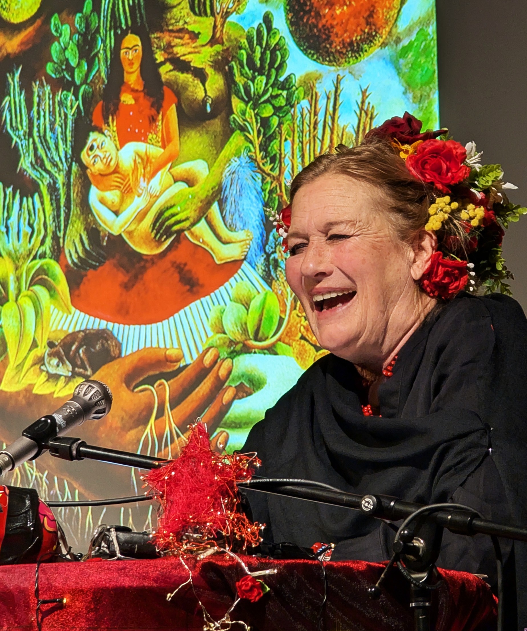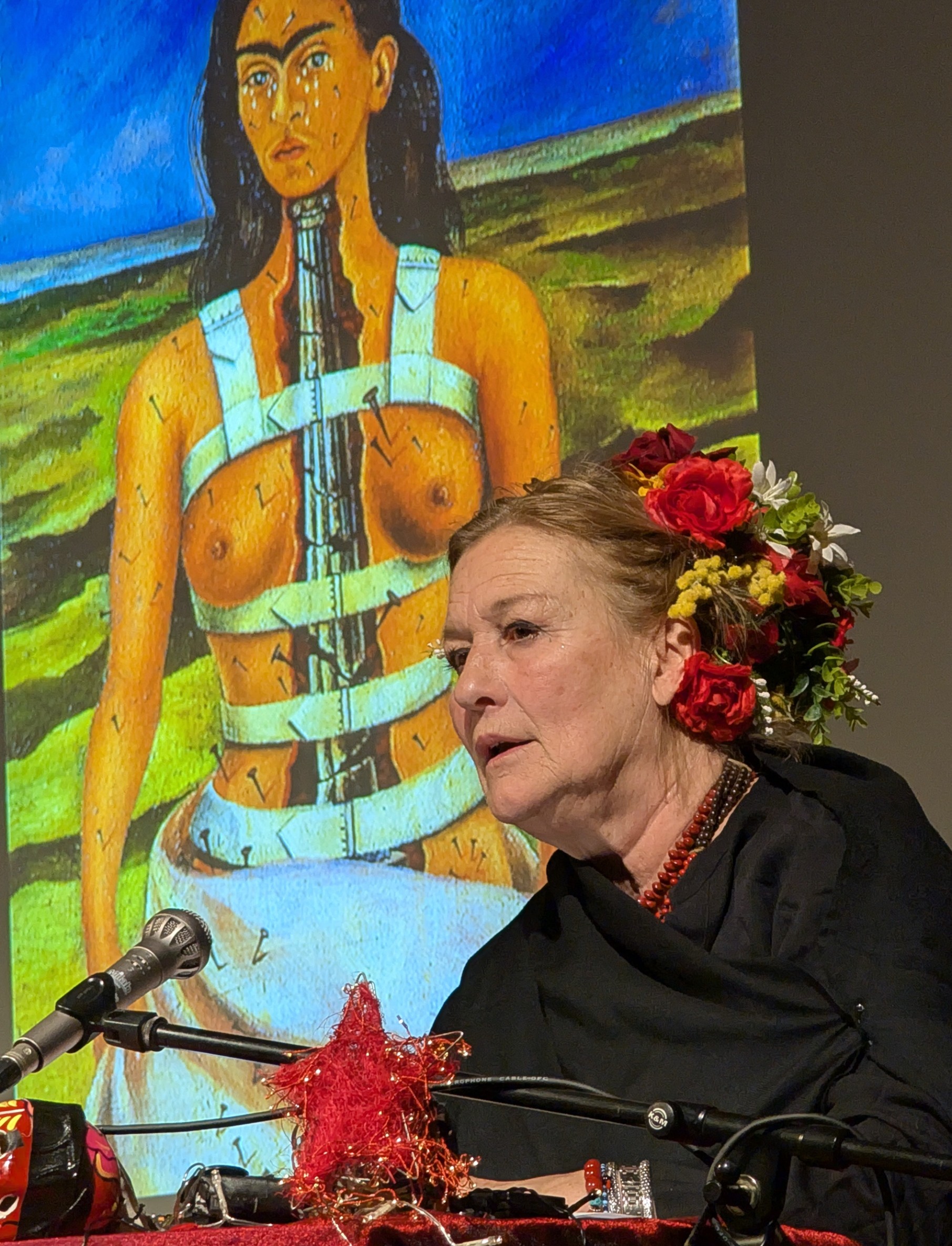 Susanne von Borsody las aus ihren Briefen. Durch ihren ausdrucksvollen Vortrag wurde das Leben und Leiden der FRIDA sehr anschaulich dargestellt. Das Trio AZUL unterstützte sie mit ihrer Musik. Und an der Leinwand wurden Bilder von FRIDA und Begegnungen ihres Lebens gezeigt.