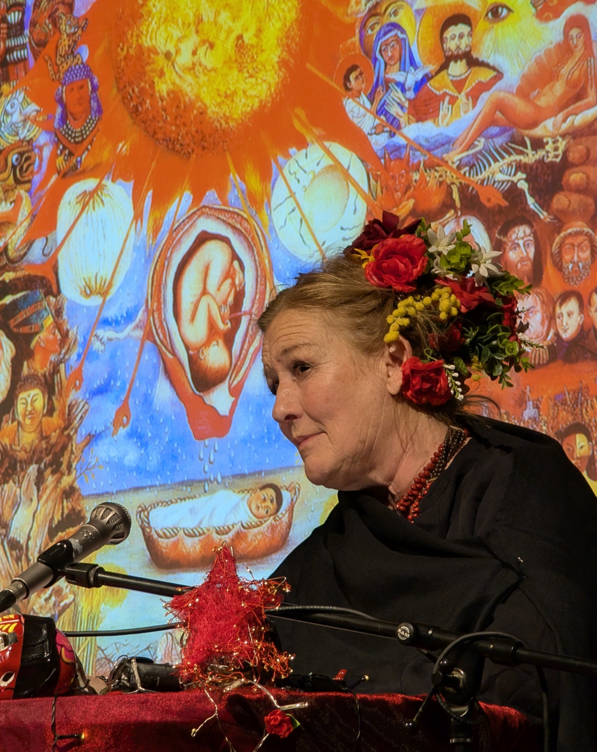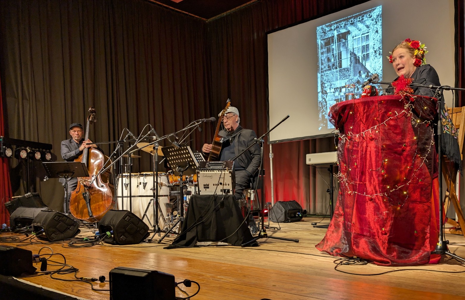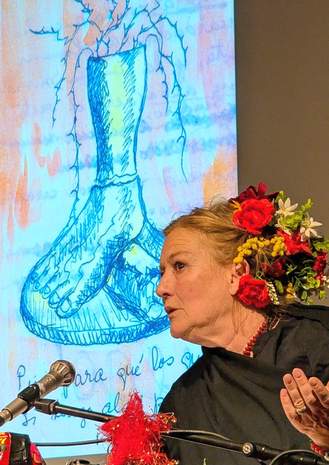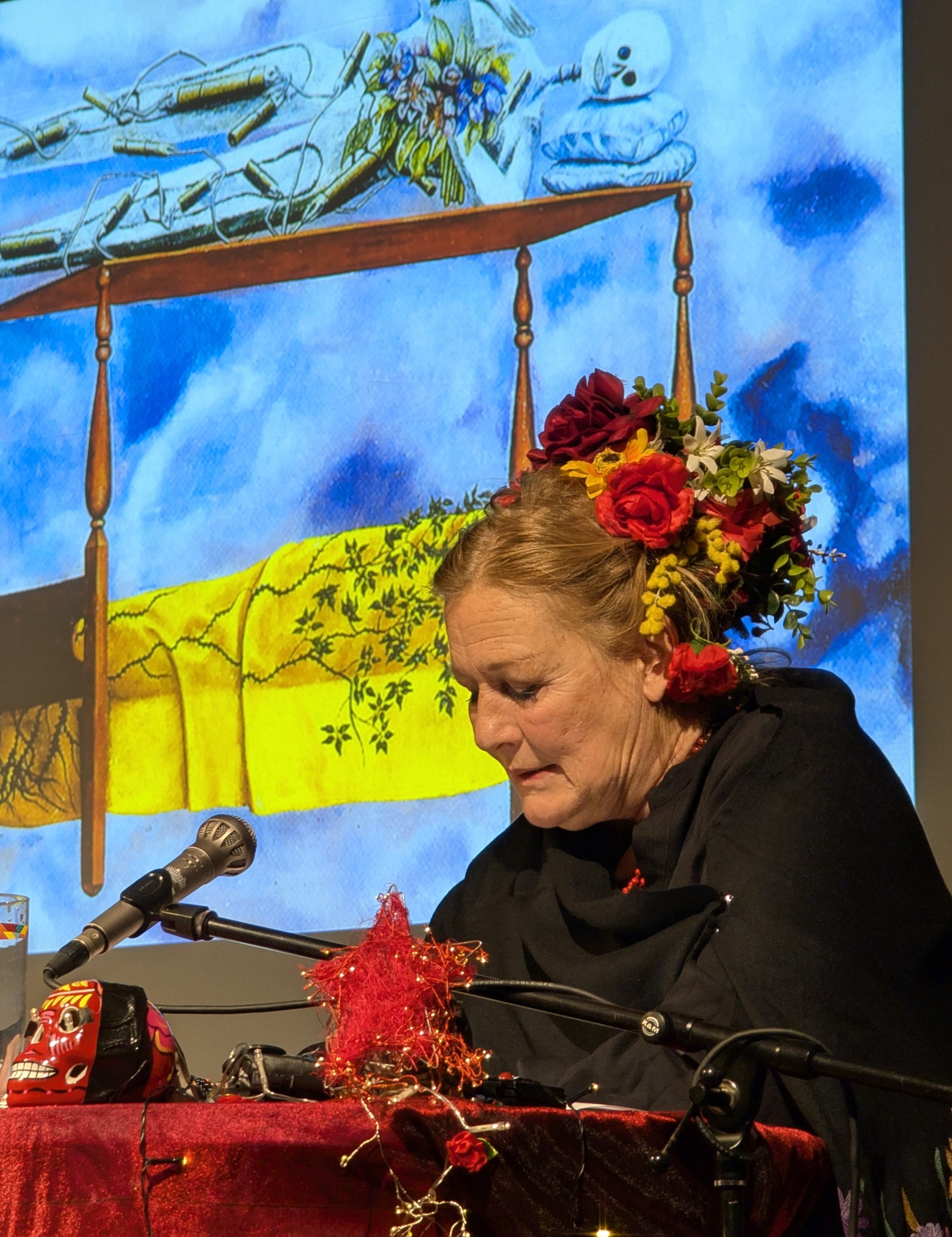 Susanne von Borsody las aus ihren Briefen. Durch ihren ausdrucksvollen Vortrag wurde das Leben und Leiden der FRIDA sehr anschaulich dargestellt. Das Trio AZUL unterstützte sie mit ihrer Musik. Und an der Leinwand wurden Bilder von FRIDA und Begegnungen ihres Lebens gezeigt.