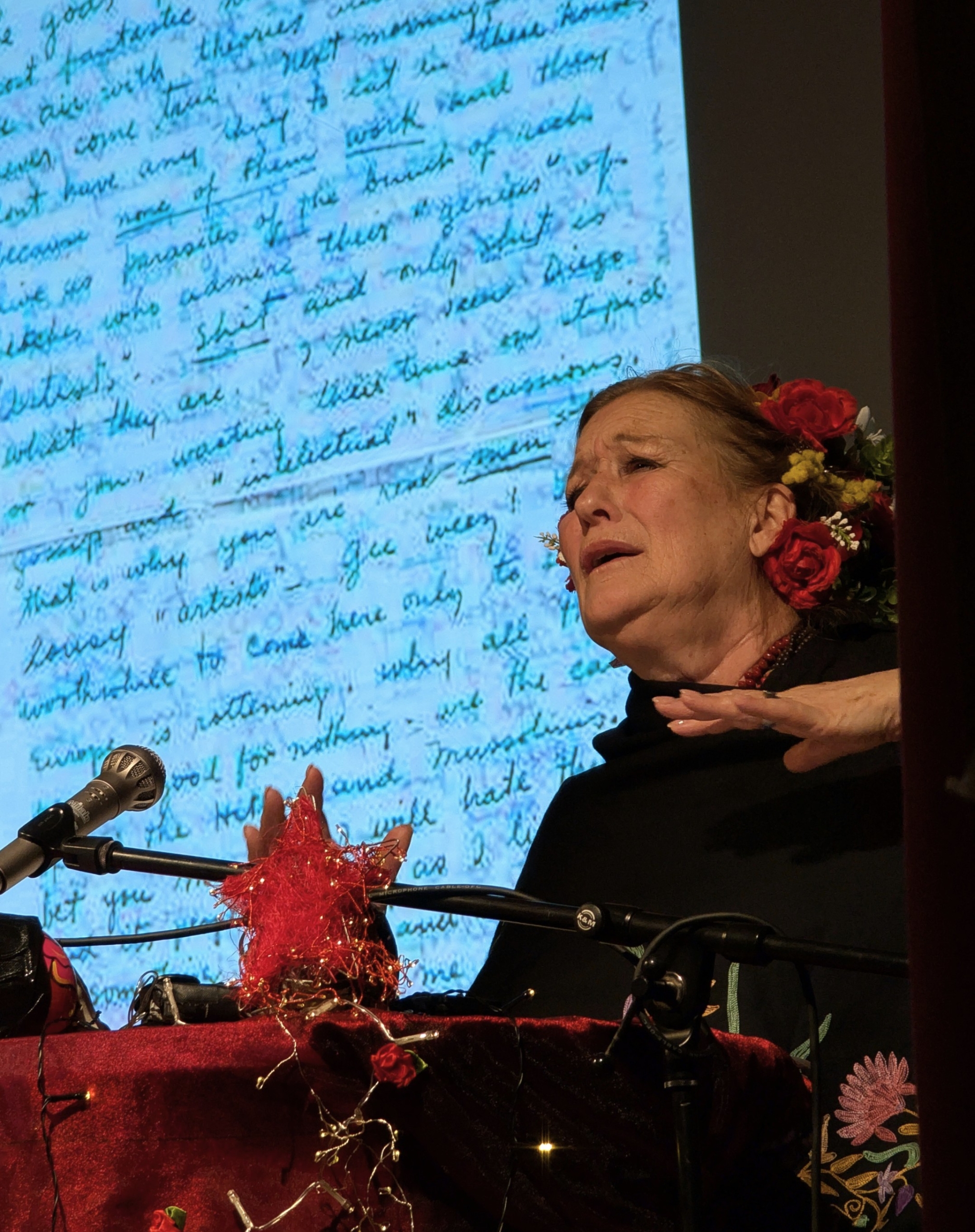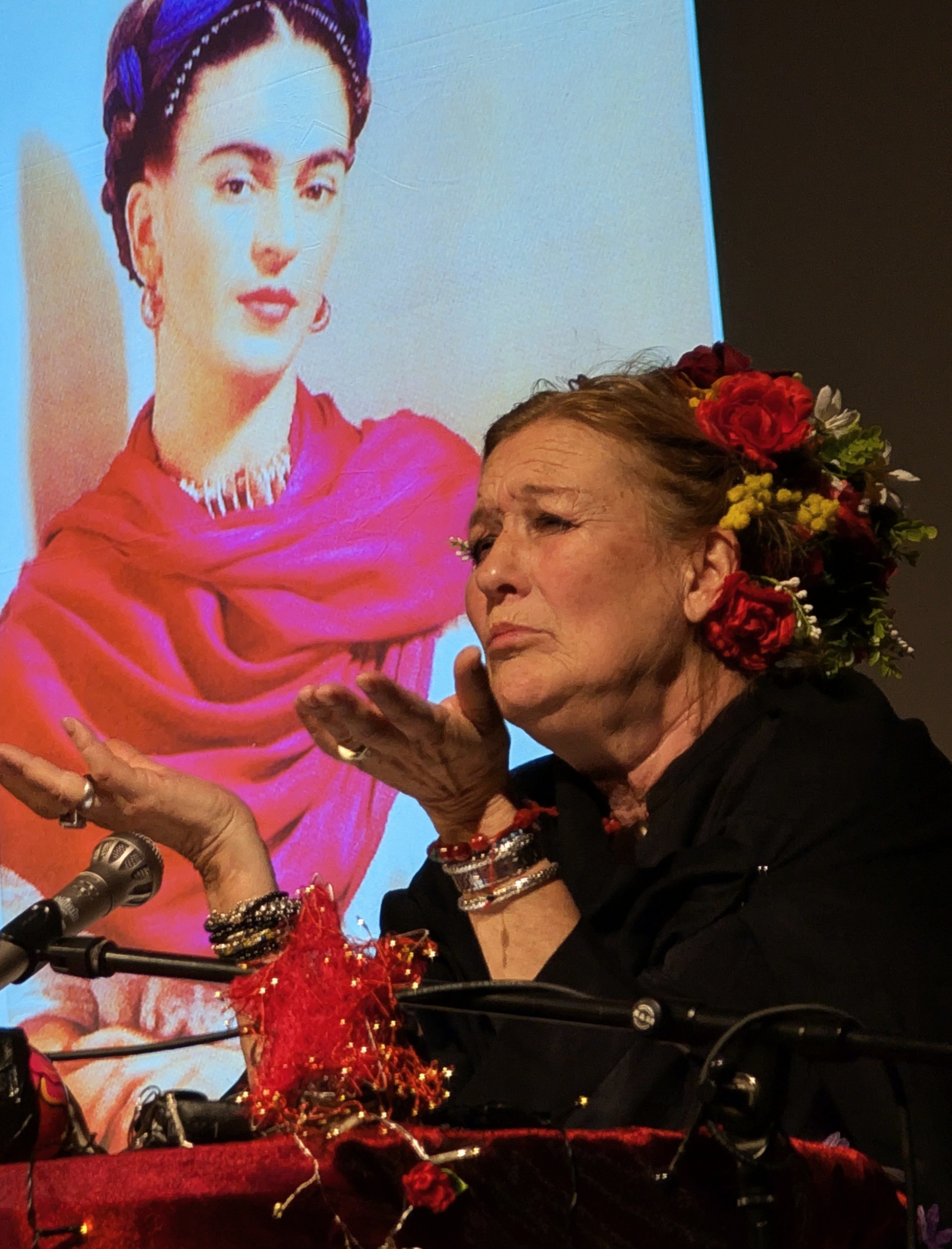 Suzanne von Borsody las aus ihren Briefen. Durch ihren ausdrucksvollen Vortrag wurde das Leben und Leiden der FRIDA sehr anschaulich dargestellt. Das Trio AZUL unterstützte sie mit ihrer Musik. Und an der Leinwand wurden Bilder von FRIDA und Begegnungen ihres Lebens gezeigt.